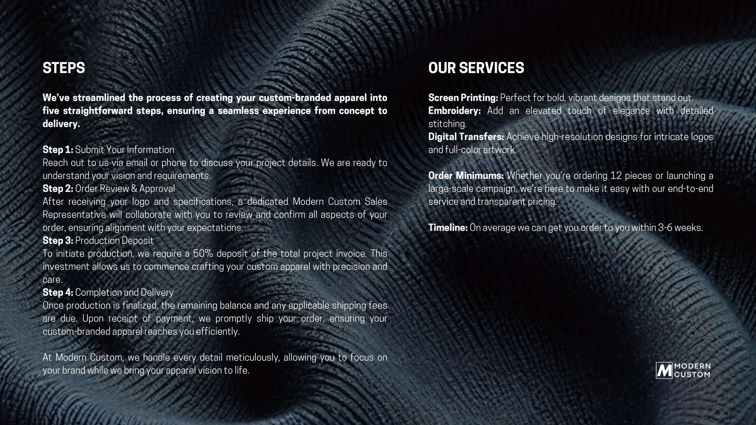 At Modern Custom, we believe in the power of a well-crafted garment to tell your brand’s story.